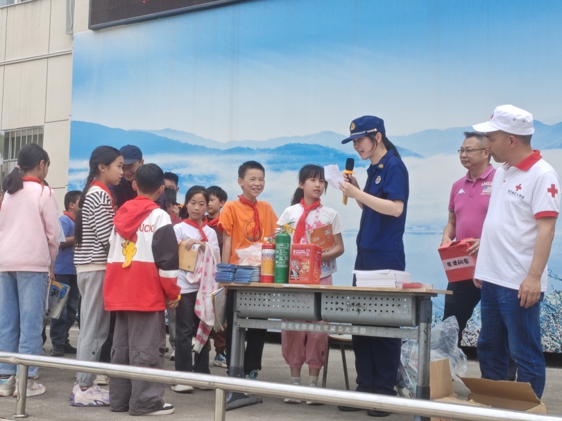 演练后,师生参观宣传展板,红十字会讲解防震知识,消防宣传员传授火灾防范与逃生技能。六年级学生曾凤怡说,“课本理论终于能在生活中用上了。”