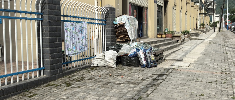 堂房村卫生服务站至妇幼保健院路口,沿街商铺存在建筑废料、生活垃圾堆占门前空间现象,人行道私拉绳索晾晒衣物形成视觉污染。航空街至老君街滨河大道段,机动车长期占用人行道停放,居民门前乱堆乱放现象突出,影响通行。