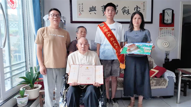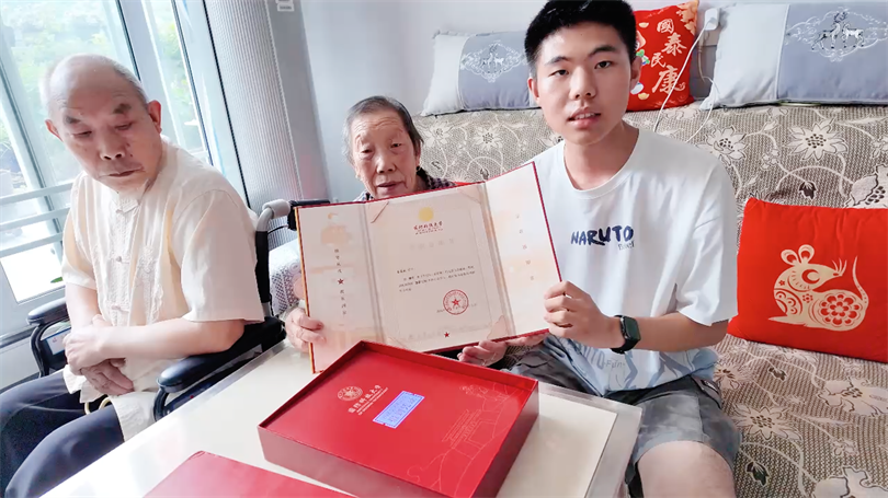 接过邮件后,姜逸辰与家人一同拆开,“国防科技大学”六个大字及金色的校徽,在录取通知书封面交相辉映。难以抑制的喜悦,让姜逸辰一家人连连拭泪。在全家人的见证下,爷爷郑重地为姜逸辰戴上荣耀绶带。