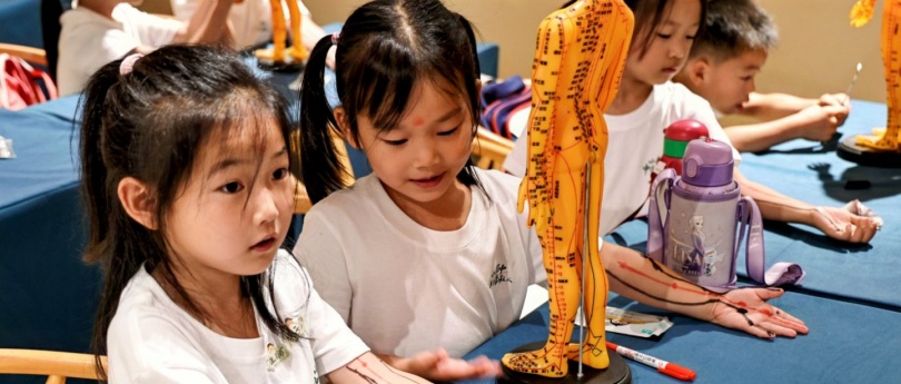 研学中,孩子们在专业导师带领下深入山林,学习辨识黄精、灵芝、金银花等常见草药。研学老师全程讲解药材特性及采摘技巧,孩子们不仅亲手制作了草药标本,还了解了《本草纲目》中“药食同源”的智慧。在古色古香的研学教室内,孩子们换上汉服,跟随老师学习拜师礼,学习“尊师重道”的国学传统。随后,中医师通过人体模型教授十二经络和穴位知识,实践环节中,导师演示了艾条制作与温灸手法,并指导家长与孩子合作完成艾灸体验。刮痧教学则成为互动焦点,孩子们用牛角板在家长身上模拟操作,并进行艾灸。