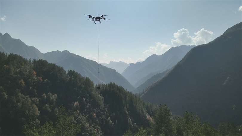 为最大限度减少对自然环境的干扰,项目部施工团队创新求变,放弃传统修路运输模式,经过多方考量和论证,转而采用“空中无人机精准投送、地面单轨道平稳运输、陡坡骡马灵活驮运”的立体协同方案。三种方式各展所长:骡马适应复杂地形,负责基础建材搬运;单轨运输车高效输送塔材等重物,占地极少;无人机跨越地形障碍,实现点对点精准空投。