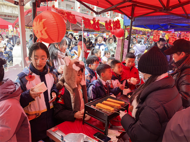 活动现场最受欢迎的是游戏互动与庙会体验环节。学校将部分教室和操场改造为游园会场,设置了多种传统文化游戏项目。学生们通过参与游戏获得积分,并凭积分在庙会区域兑换美食。庙会区域内,18个美食摊位有序排列,牛肉面、炒米粉、关东煮、烧烤、冰糖葫芦等传统小吃应有尽有。家长志愿者忙碌于各个摊位,学生们穿梭其间,品尝美食、体验传统庙会的热闹与乐趣。六年级学生刘紫涵兴奋地说:“参加了各种游戏,品尝了各种美食,感受到了传统文化和传统美食的魅力。”