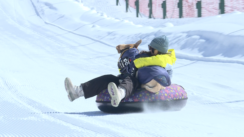 主人与爱犬一同搭乘雪圈等滑具,在宽阔的雪道上滑行,时而驻足互动,时而并肩前行,欢声笑语与雪地的静谧美景相映成趣,吸引了不少游客驻足拍照。