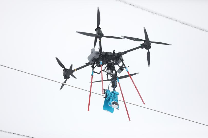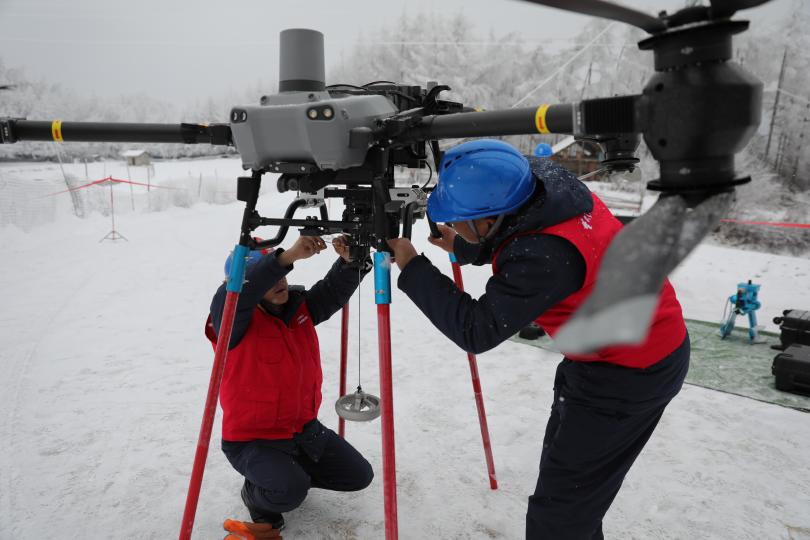 35千伏宋坪线途经大山深处,部分区段海拔超2300米,冬季风雪频发,传统人工除冰难度大、风险高、效率低。此次投用的智能碾压式除冰机器人,采用多源传感与自适应控制技术。作业时,无人机凭借厘米级定位精准投送机器人至#048-#051号塔覆冰严重区段,通过防滑行走轮与卡线轮咬合导线,在零下8摄氏度严寒中稳定就位。