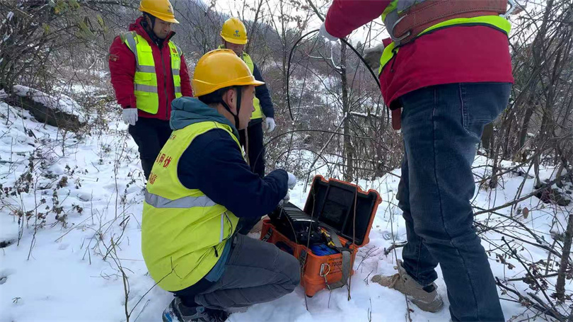 故障现场寒风凛冽,积雪深近十厘米,车辆无法直达作业点,维护人员肩扛熔接机、测试仪表等设备,徒步上山。在零下10℃的寒风中,维护人员穿戴好安全装备,攀爬30米高的铁塔,争分夺秒地排查故障、更换馈线。