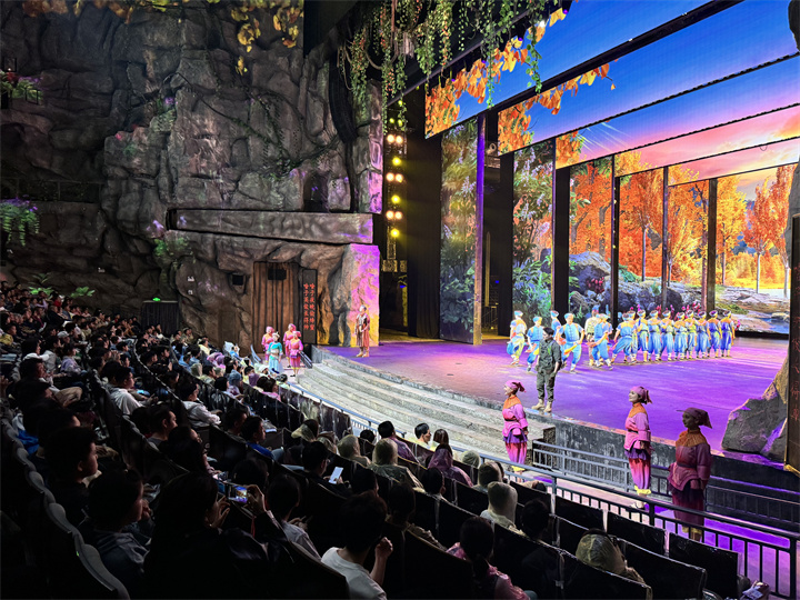 大型情景舞台剧《秘境神农架》以延绵百年的神农架野人科考这一真实历史为背景,以世人关注的“神农架野人之谜”为切入点,与观众一起探寻野人之谜、“秘境”奇迹。除了剧情引人入胜之外,剧院还加大了沉浸式体验技术的创新应用,结合特效装置打造全包围的视觉、听觉、触觉等体验空间,带给观众声、光、水、雾、电沉浸式体验。“五一”第一天,剧院上座率便达到86%。