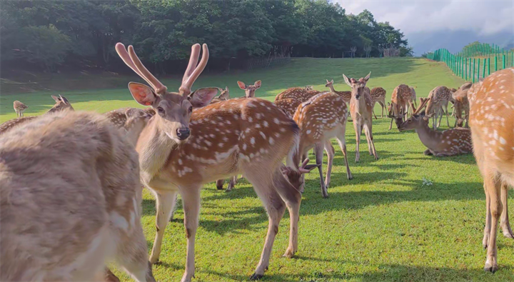午后,雾气渐散,澄澈湖水如同一面明镜,将蓝天白云、青山绿树尽数纳入怀中。一叶扁舟轻轻划过湖面,涟漪荡碎倒影,惊起几声赞叹。鹿苑中,梅花鹿悠然踱步,棕黄皮毛与翠绿草甸相映成趣,宛如油画般美好。