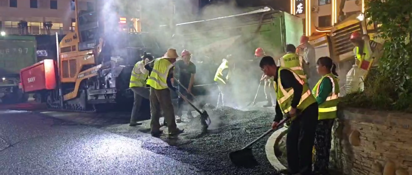 当晚9点,木鱼路全线封闭施工,2台摊铺机、3台压路机、1台水罐车、13台运输车以及超过50名施工人连夜作业,近10小时完成约1公里路段铺设。