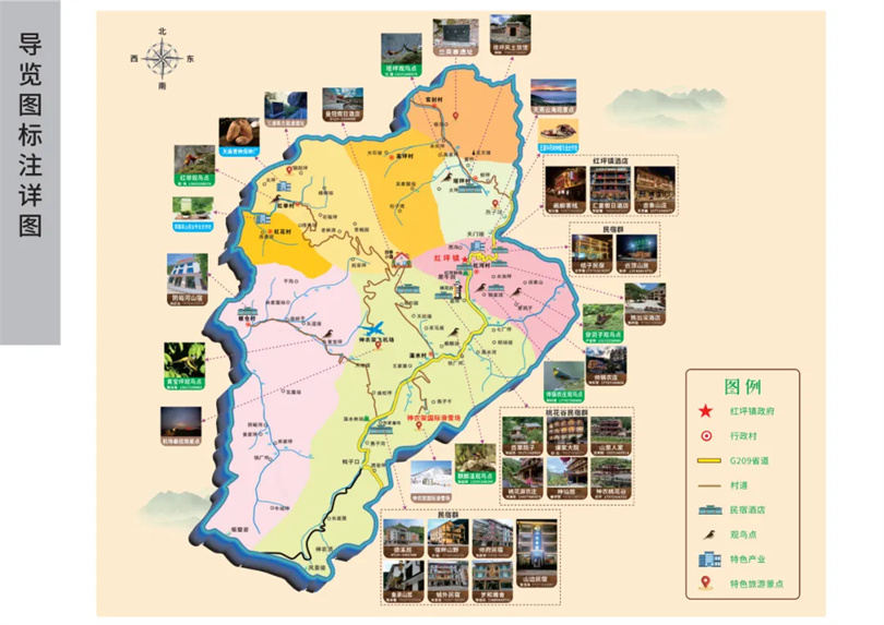 导览图系统整合了散落在村落、溪谷、林间的自然秘境、人文风情及特色农旅产业(茶园、果园、民宿聚落、手工作坊等),首次清晰、全面地展现红坪作为深度游目的地的全貌。图中明确标注全镇主要景点、特色村落、徒步小径、观景平台及服务设施(停车场、卫生间、游客中心、特色餐饮、精品民宿)等位置,方便游客快速定位、规划个性化路线,告别盲目寻找。