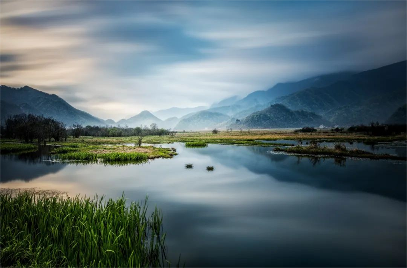 傍晚7点左右,大九湖的另一重头戏——晚霞如期而至。太阳斜射光线穿透厚厚云层,波长较短的蓝绿光被大气散射,唯余红、橙、黄光投射于水汽之上,形成绚烂霞光。