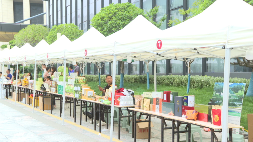 展销区摆满神农天池蜂蜜、天池黄豆、二十四节气茶、野生葛根粉等特色产品,观众纷纷品尝选购。
