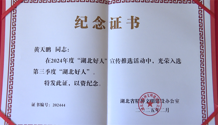 神农架林区融媒体中心(记者房泽洋)在2024年“湖北好人”第三季度评选中,神农架国家公园管理局黄天鹏凭借突出贡献获此殊荣。近日,林区党委宣传部领导赶赴木鱼镇,将 “湖北好人”纪念证书交到黄天鹏手中。