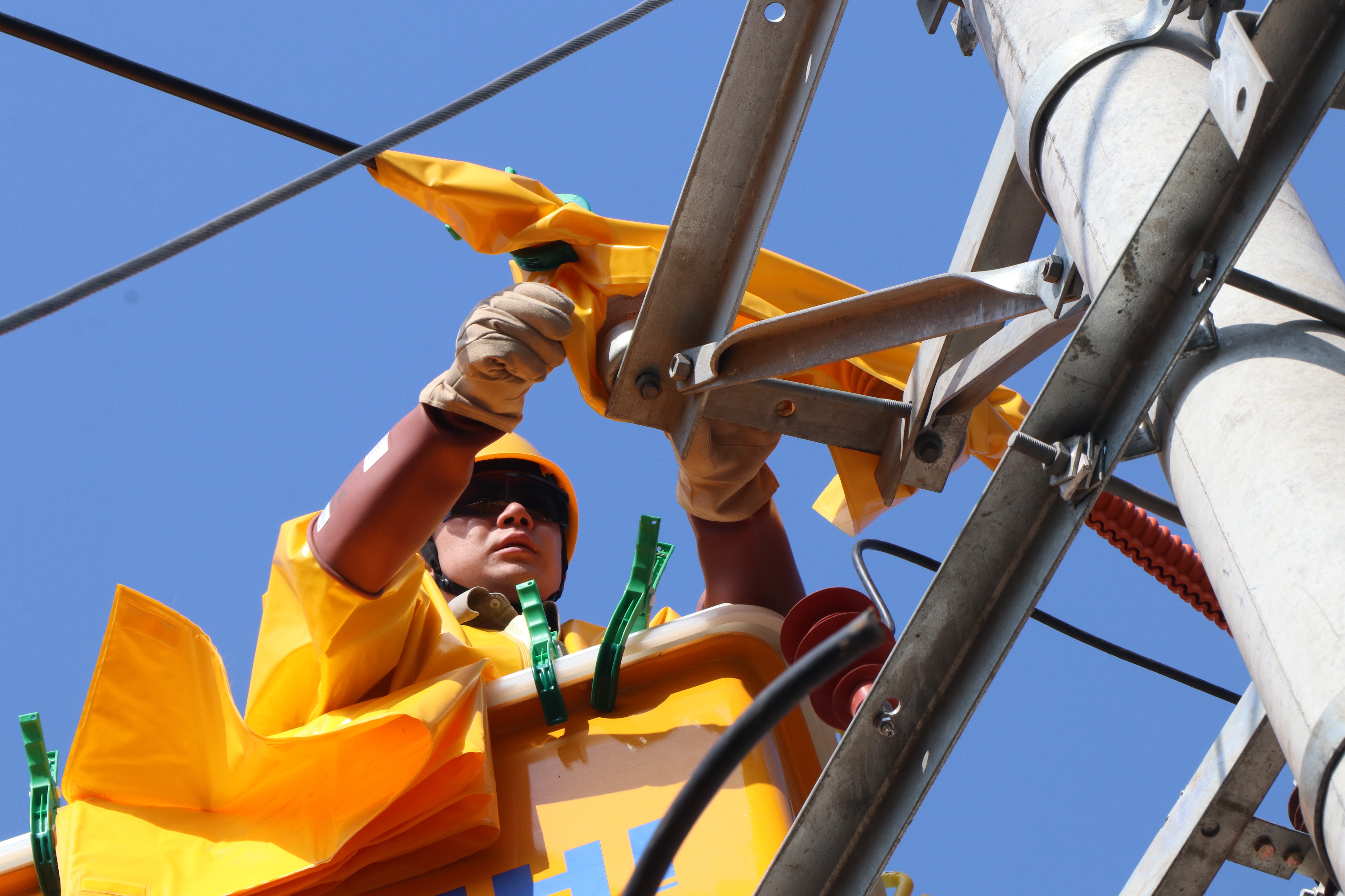 当天,一辆黄色绝缘斗臂车在安全围栏的保护下进行施工作业。只见斗内作业人员先将作业区附近的10千伏线路用绝缘毯覆盖住,然后小心翼翼地分别将一根导线和一相线路主线的一小截除去绝缘皮,并用线夹固定起来,经过2小时的不间断作业,顺利完成引线搭接工作,确保了10千伏新唐线全线29个台区、583位用户的生产生活正常用电,也保证了聚龙湾酒店施工的有序实施。