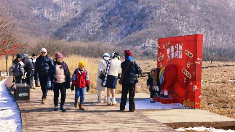 “这里没有喧嚣,只有山水与年味相伴,太适合慢下来感受春节了。”来自陕西的游客刘女士一边拍摄一边感叹,“步道旁的民俗展板让孩子了解了很多传统年俗,这种沉浸式体验特别有意义”。景区内,亲子家庭、摄影爱好者络绎不绝,大家漫步林间,在草木清香中品味新春的宁静与美好。