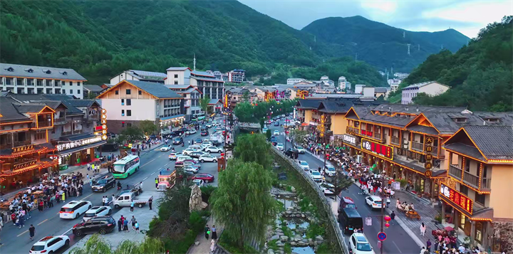 神农架林区融媒体中心(记者罗任 胡鑫)当暮色笼罩神农架,大九湖坪阡古镇的灯火次第点亮,盐溪河两岸的明清川鄂风格建筑披上流光,宛如一条璀璨的“地上星河”。